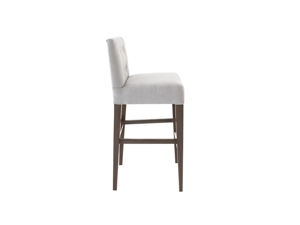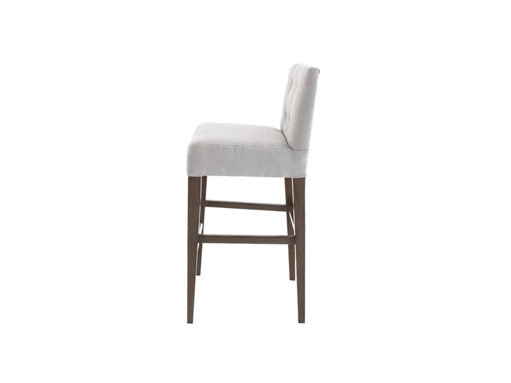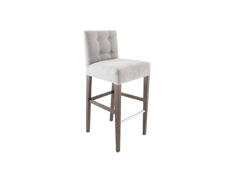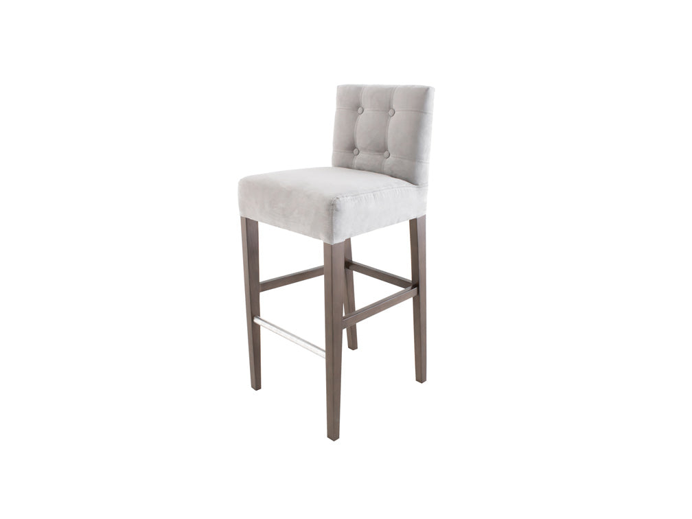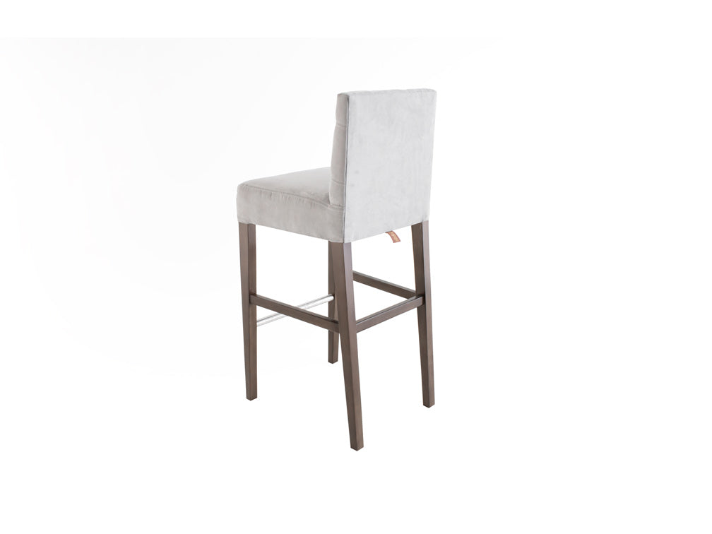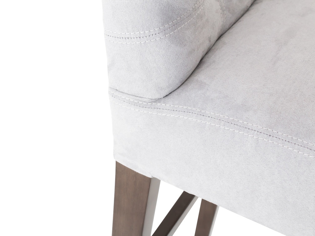 Este banco ilustrado es de suede en color plata, con base de madera de poplar en color nogal y acero rayado.