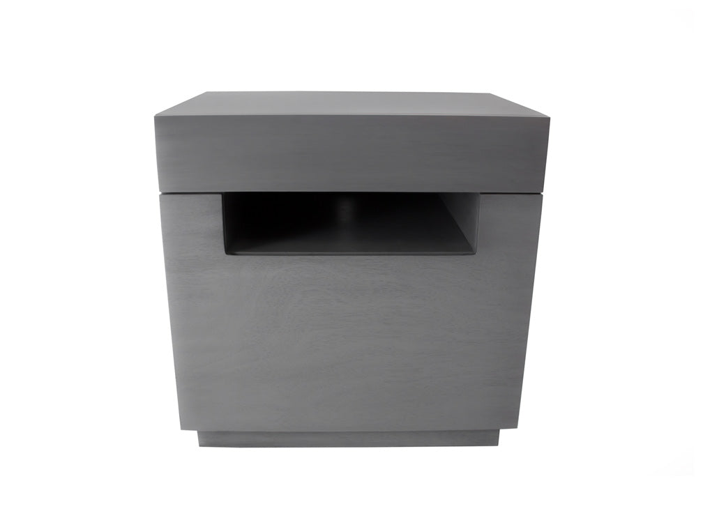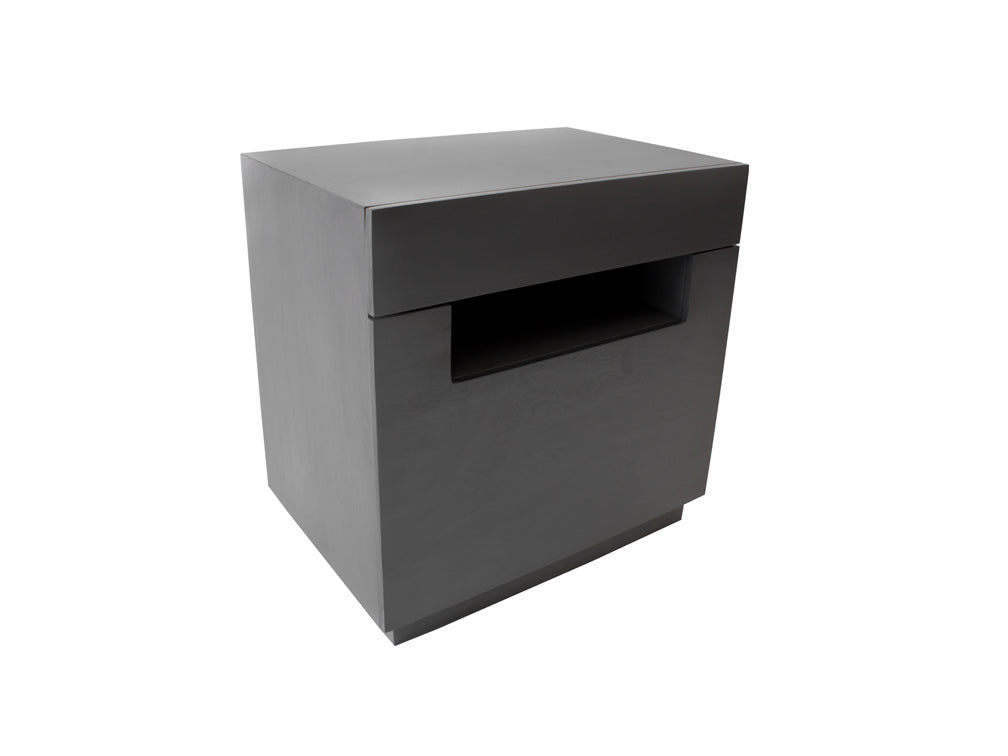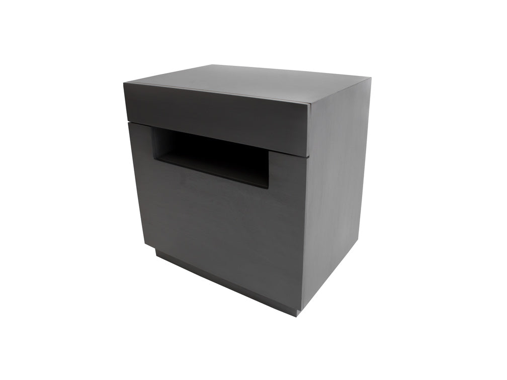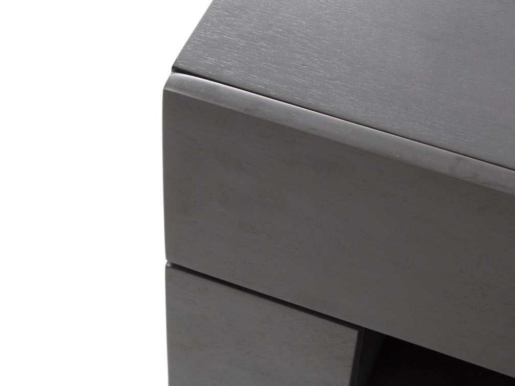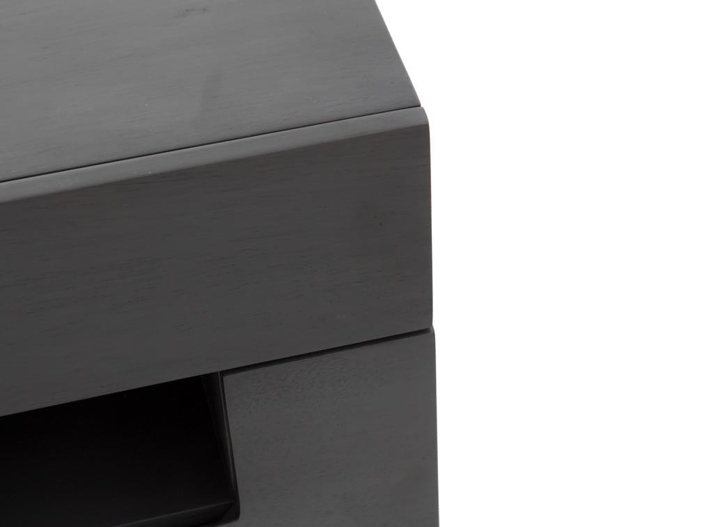 Tiene dos cajones sin jaladera para darle un estilo contemporáneo y a su vez evitar golpes. En su lugar, tiene un espacio abierto de 10 cm de alto.