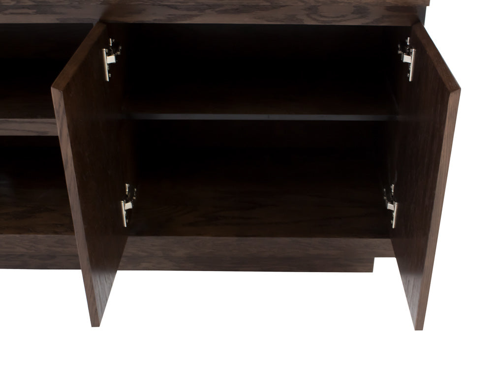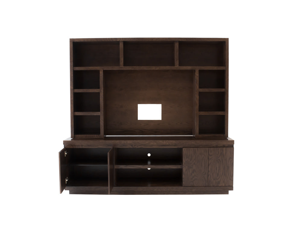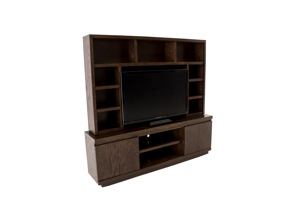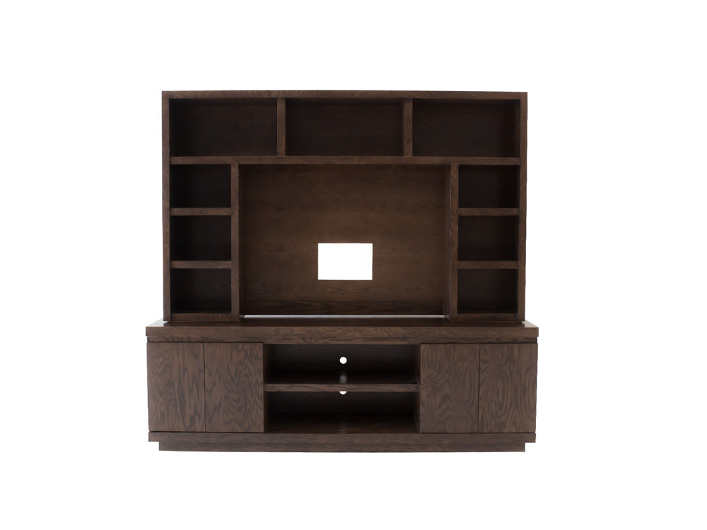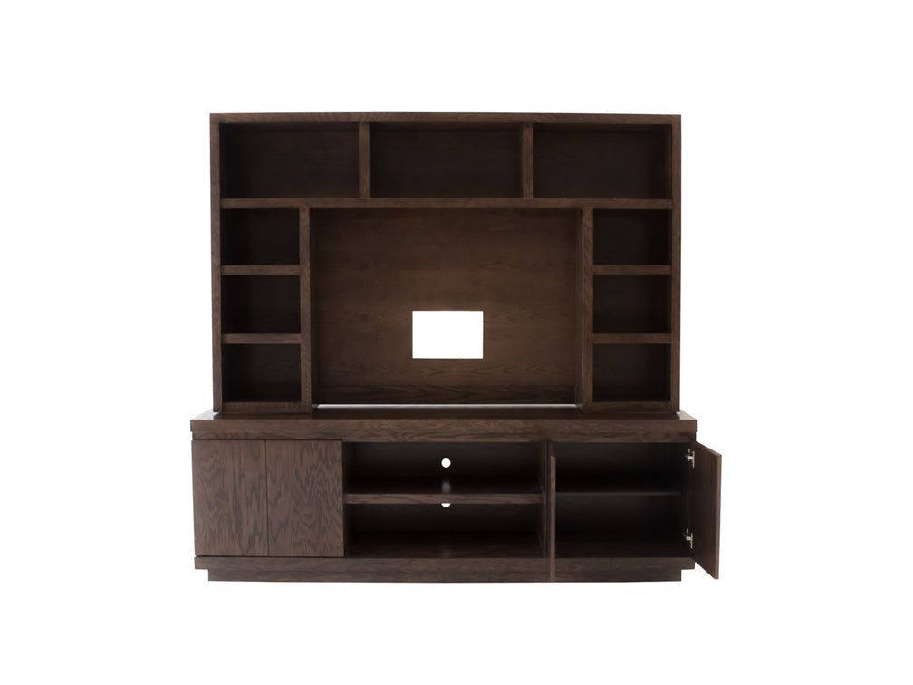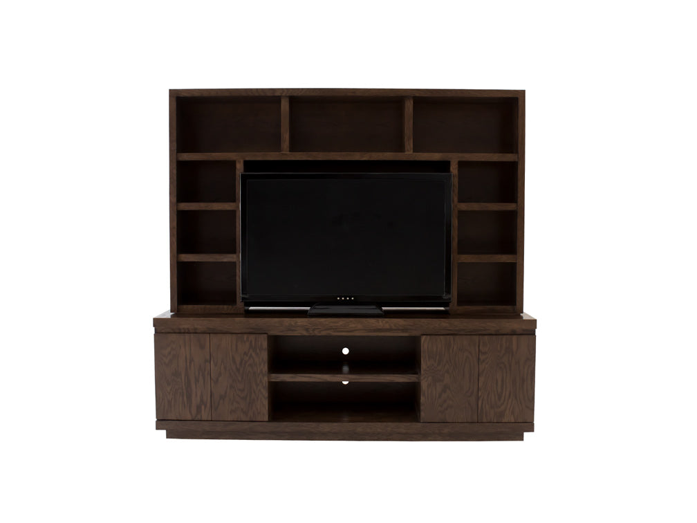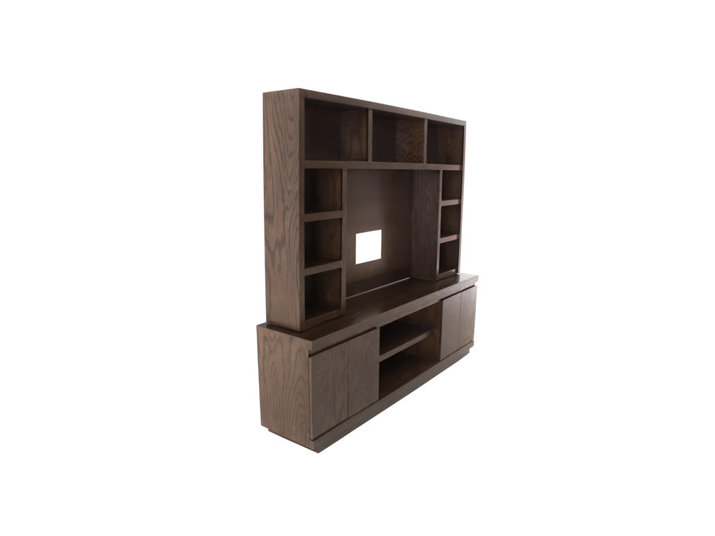 Este centro de entretenimiento ilustrado es de madera de mdf con enchapado de encino en color nogal claro.