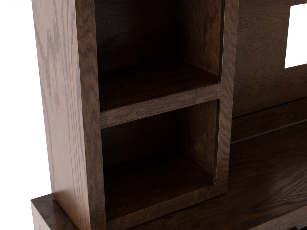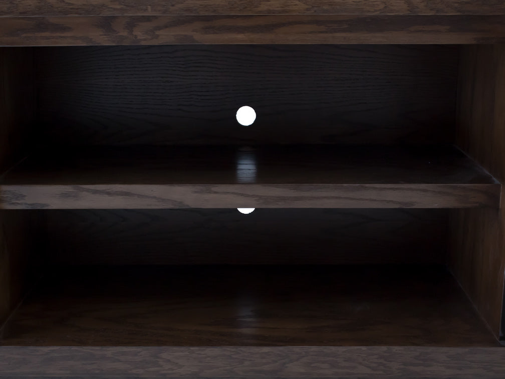 Y en la parte central, tiene dos entrepaños en los que podrá colocar consolas u objetos más largos. También tiene un pasa cables para evitar tener los cables al frente y verse antiestético.