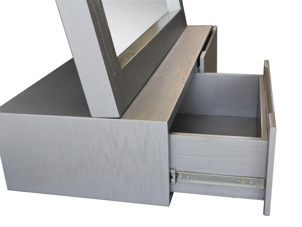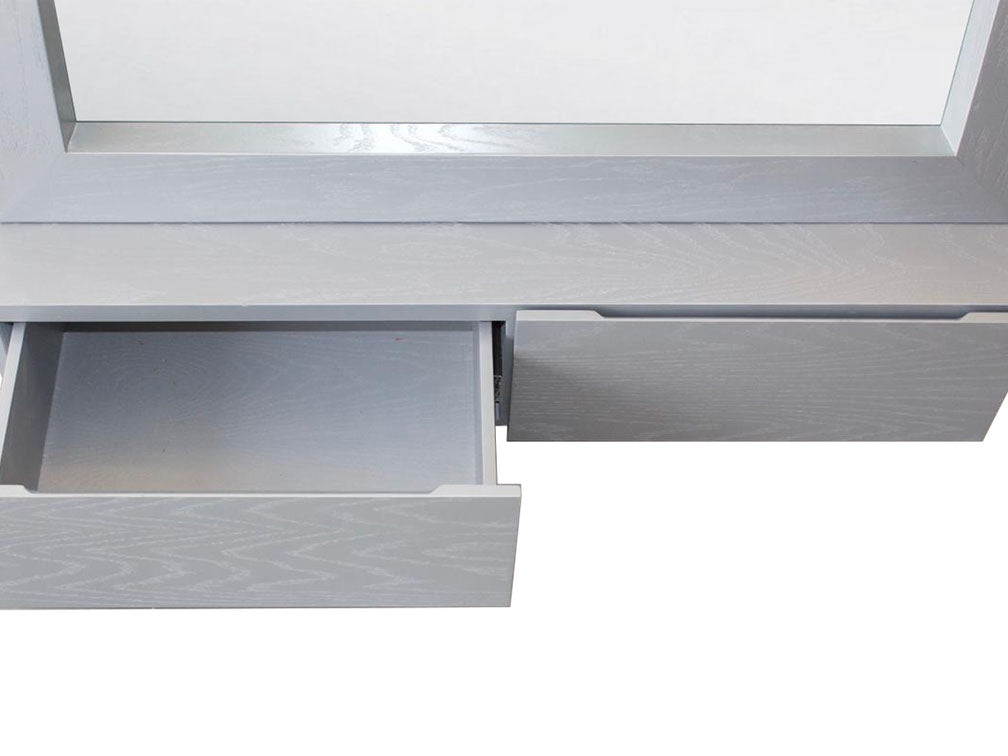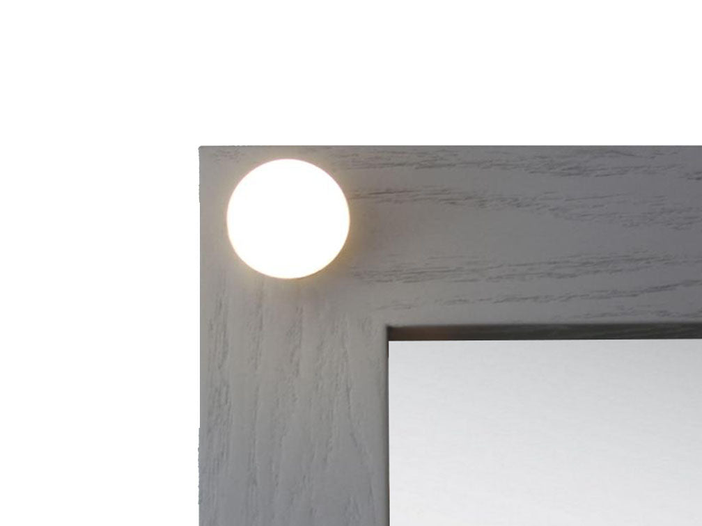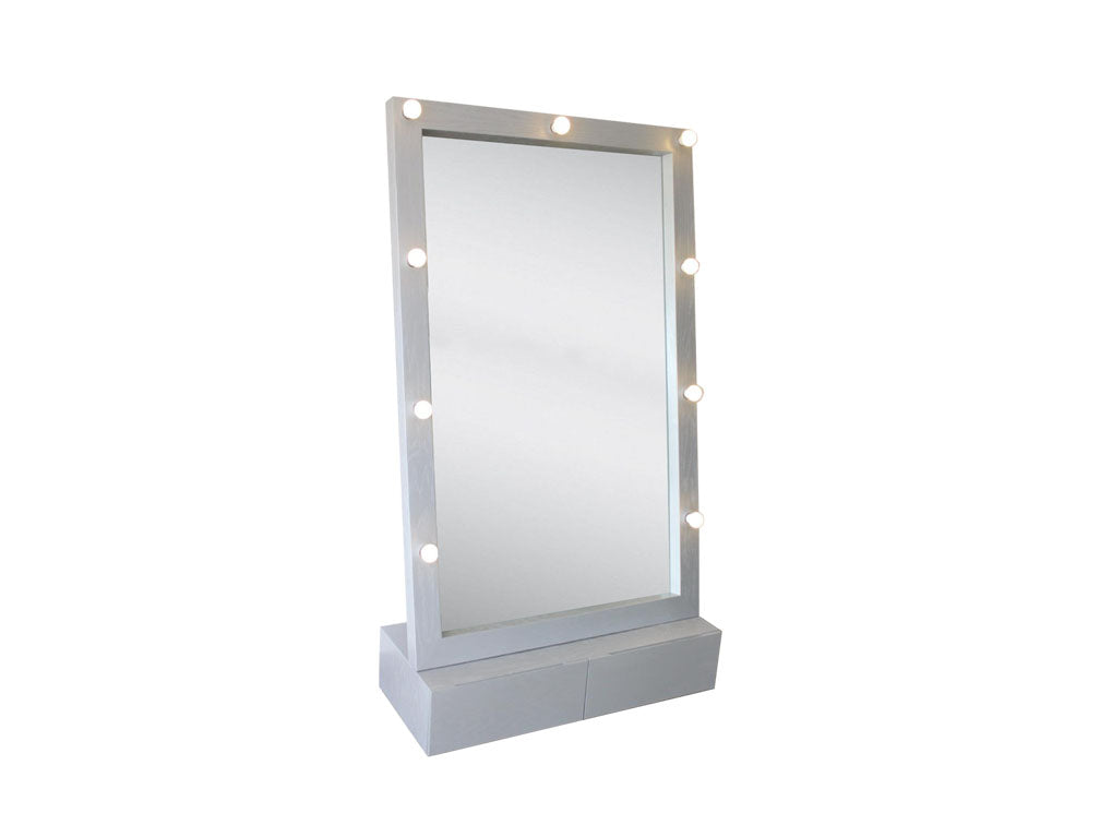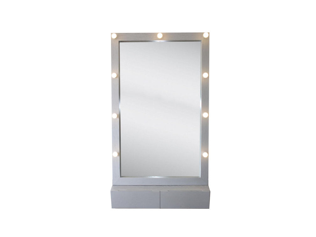 Espejo moderno de hermoso diseño ideal para complementar tu recámara. Este espejo posee unas medidas de 100 cms de largo, 40 cms de ancho y 180 cms de altura. Esta fabricado en MDF enchapado en encino color plata y trae nueve luces led y dos cajones, con botones, para guardar objetos. Este mueble se fabrica sobre pedido y está disponible en gran variedad de colores para que se adecué a tu gusto y el estilo de tu habitación.