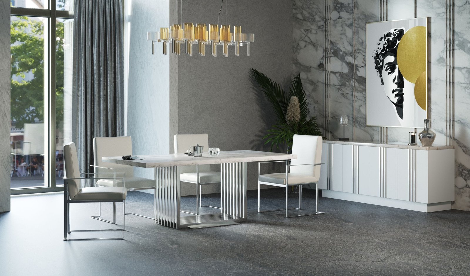 La deslumbrante mesa de comedor moderna de mármol y acero inoxidable