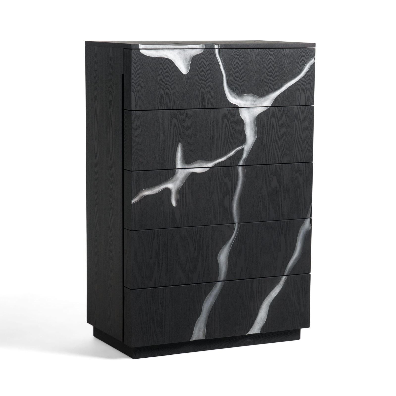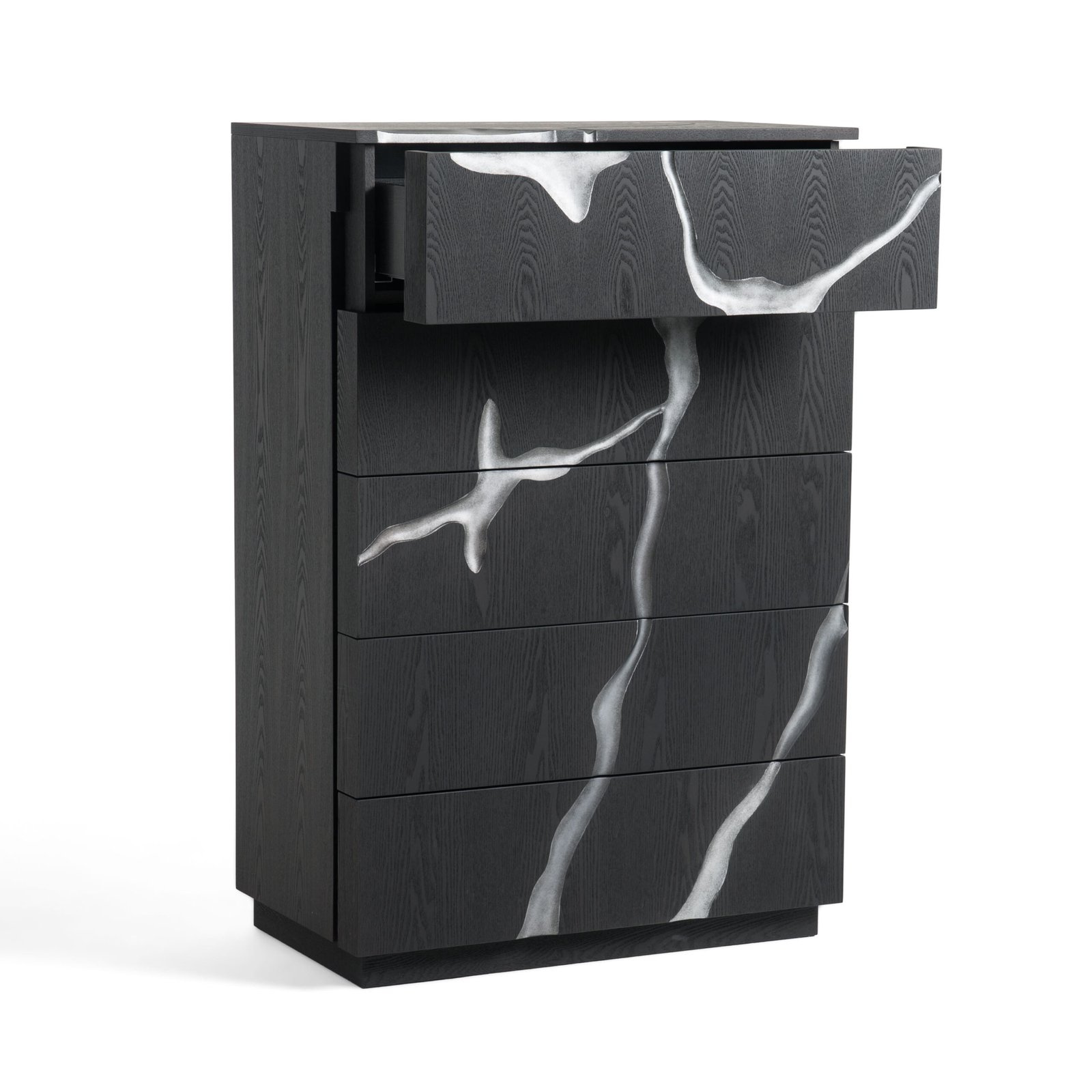 detalles artísticos pintados en plata. Los cajones tienen tiradores ocultos
