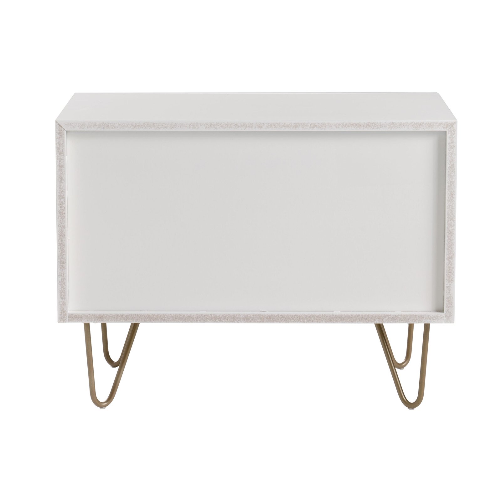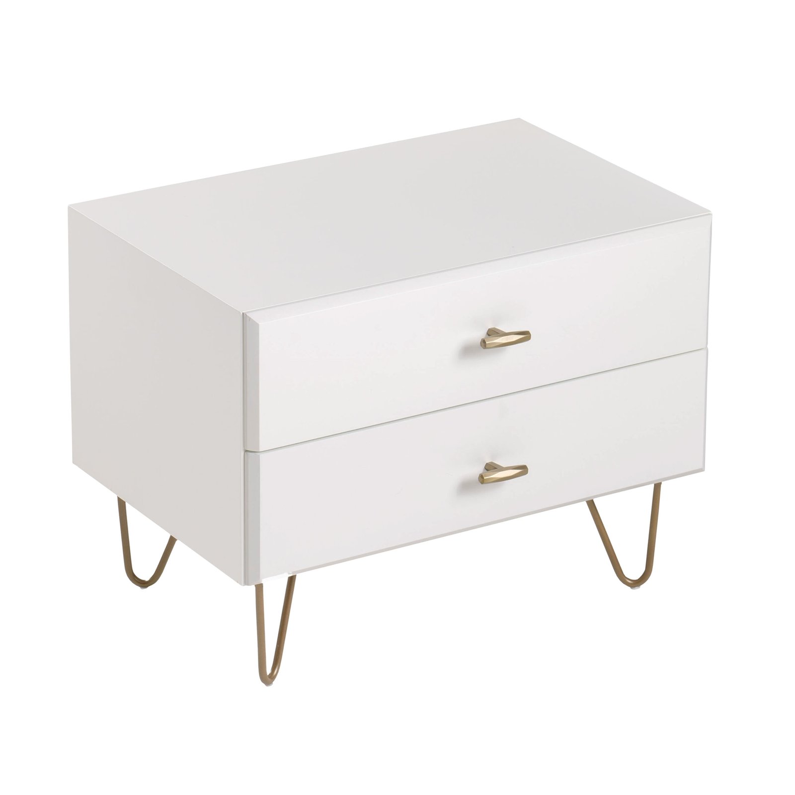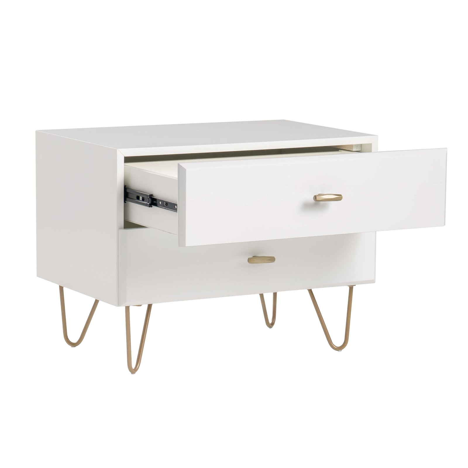 y su Nightstand. Su sencilla forma rectangular tiene un acabado blanco en la