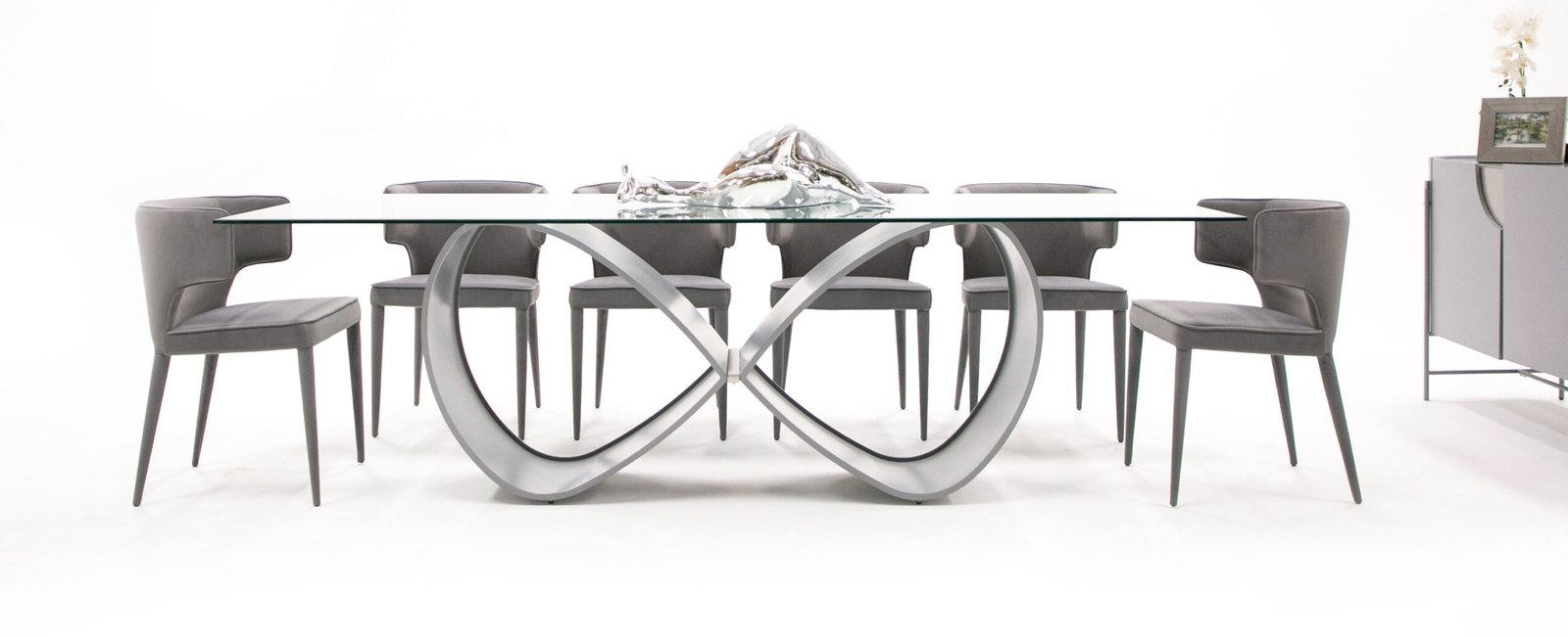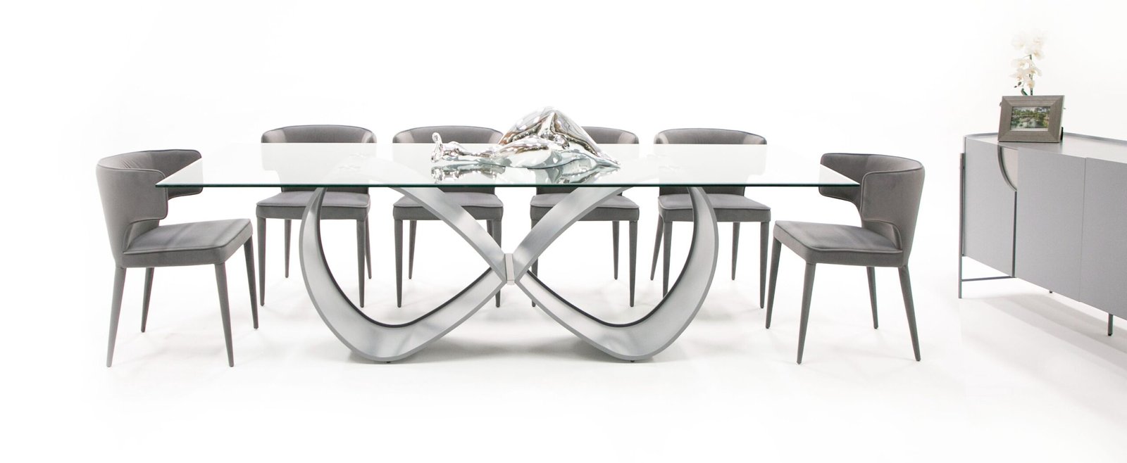 ¡El impresionante estilo moderno de esta mesa de comedor de vidrio y gris