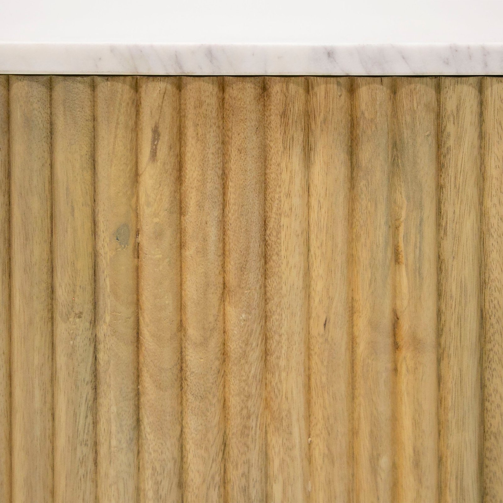 Esta mesa moderna cuenta con una tapa de mármol blanco de Carrara y una base