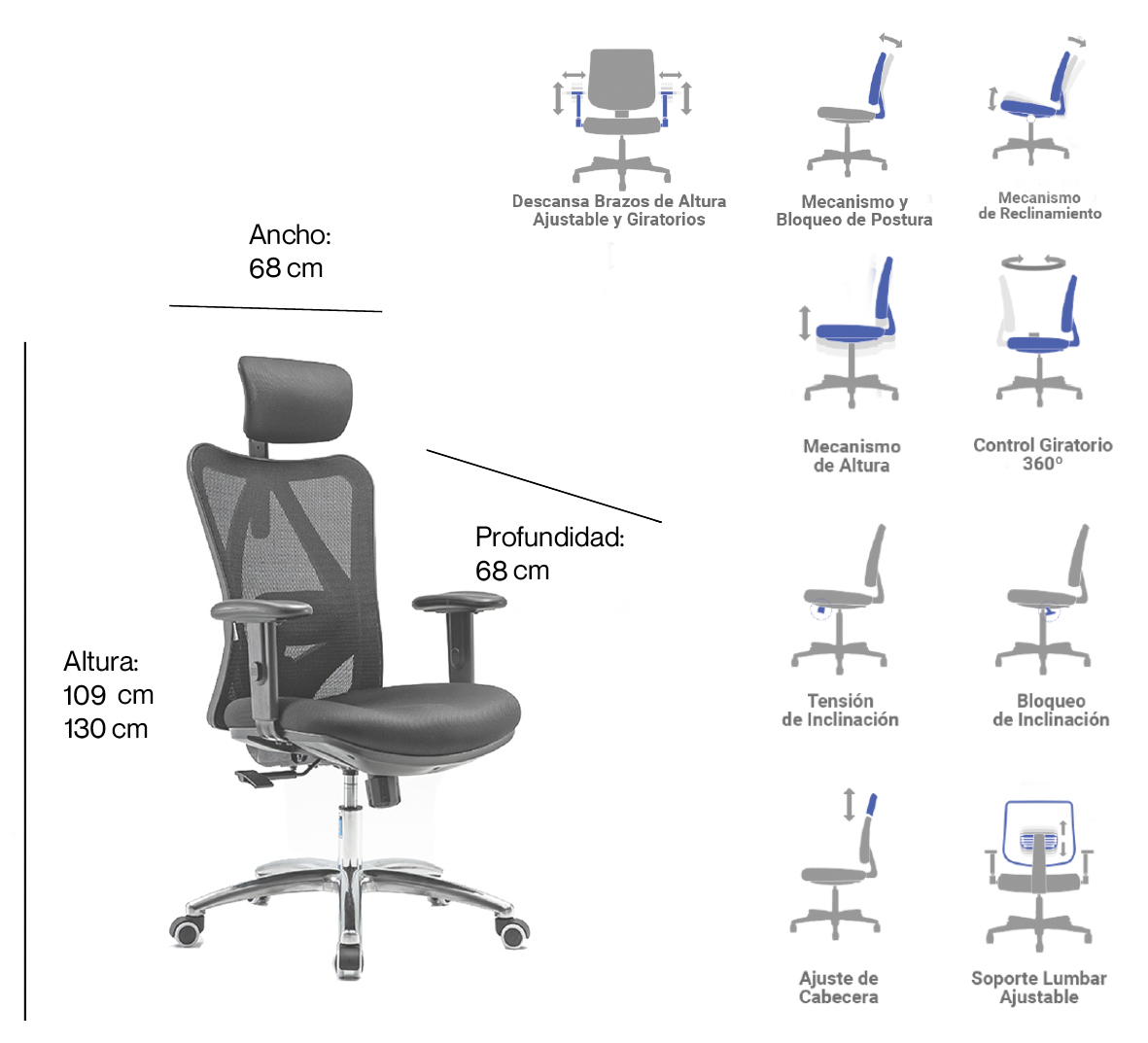 - Mecanismo de inclinación con bloqueo de 3 posiciones.