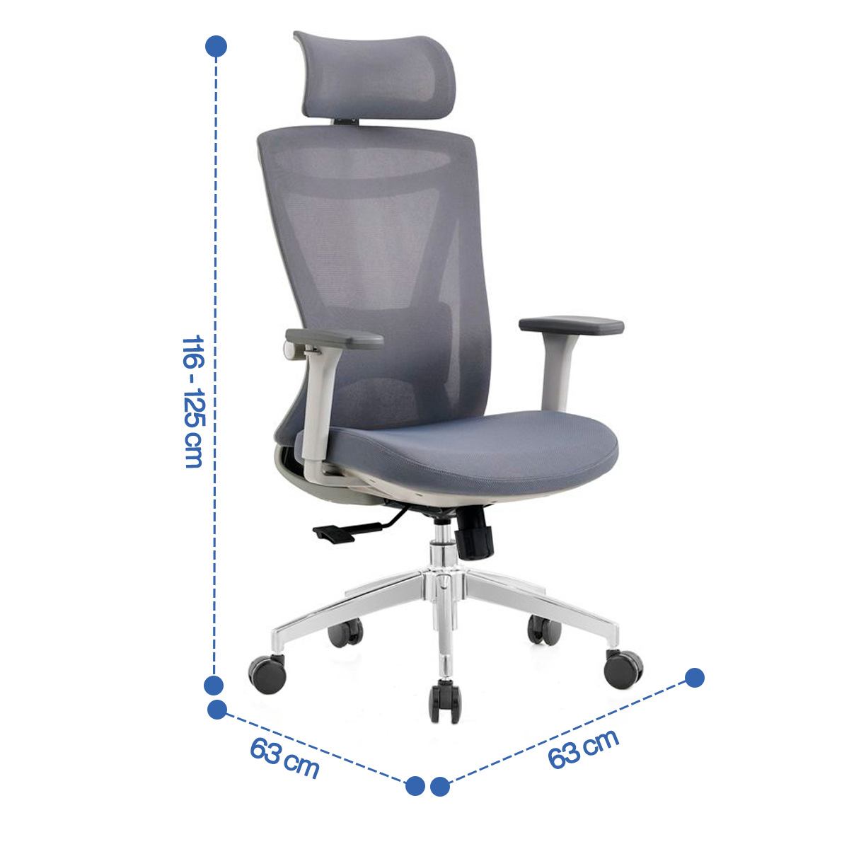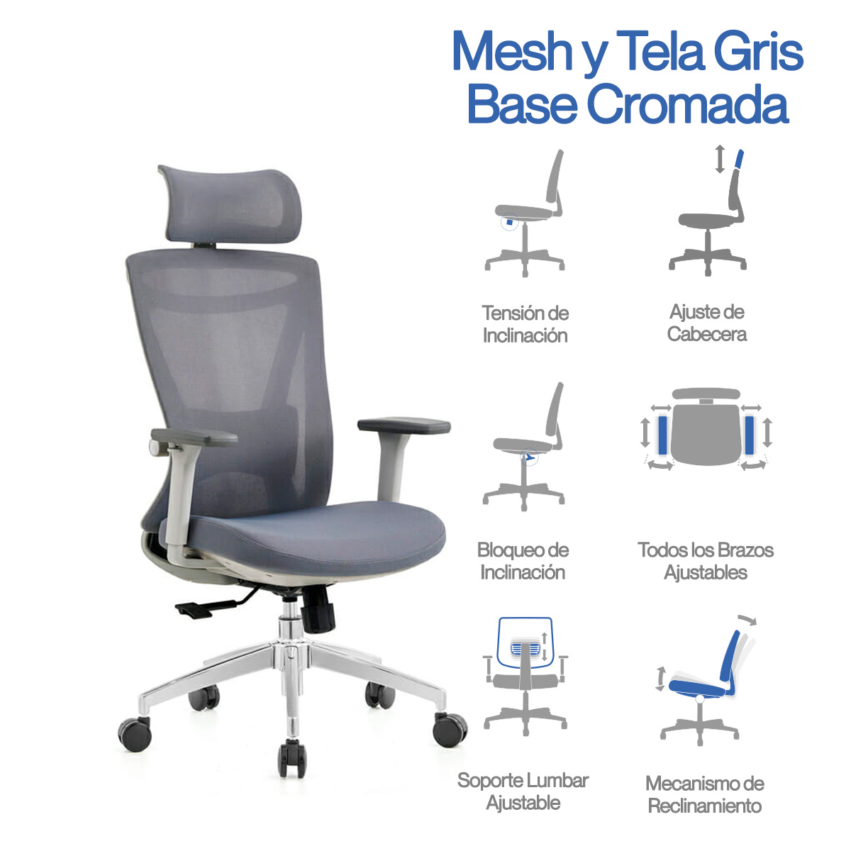 - Tapizado en mesh en el respaldo y asiento en tela color gris de alta densidad.