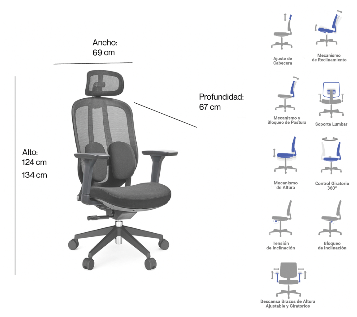• Mecanismo de soporte lumbar de 3 posiciones.