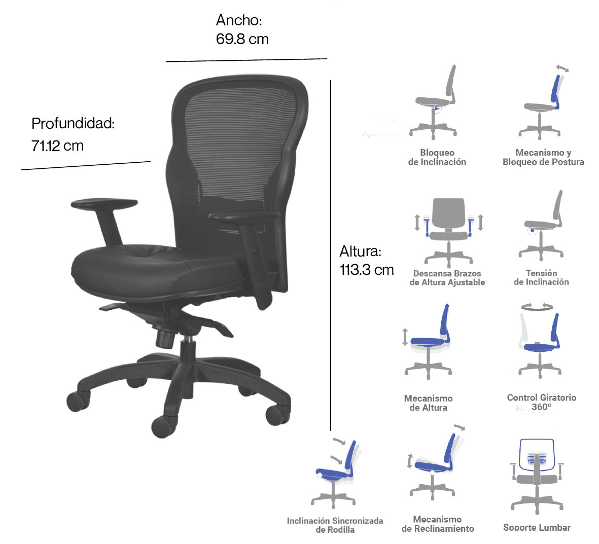 • Respaldo alto con soporte lumbar en color negro y doble capa de mesh transpirable, adaptándose a la parte superior del cuerpo para un soporte óptimo.