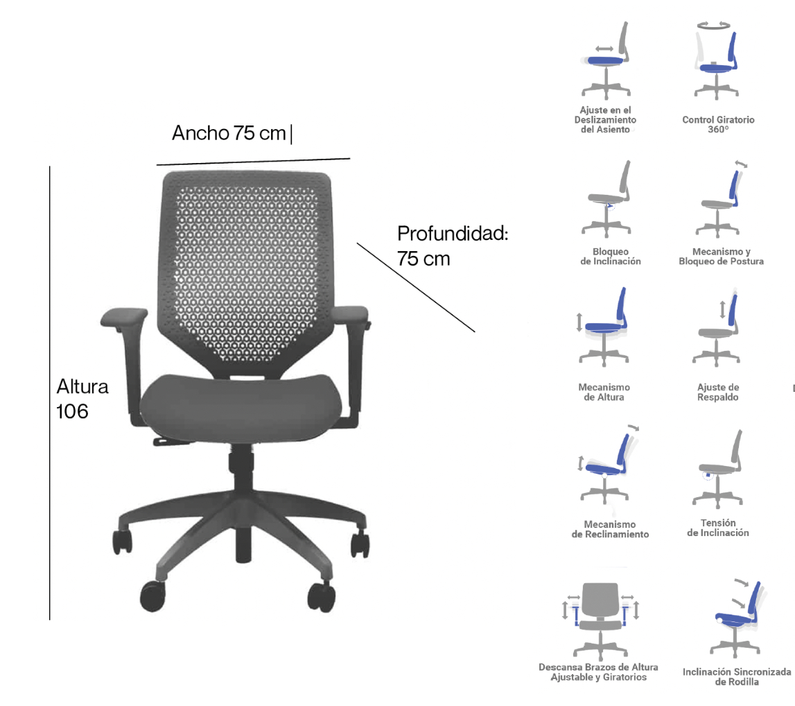 - Mecanismo de syncro que desliza el asiento hacia adelante al reclinar el respaldo para una postura natural.