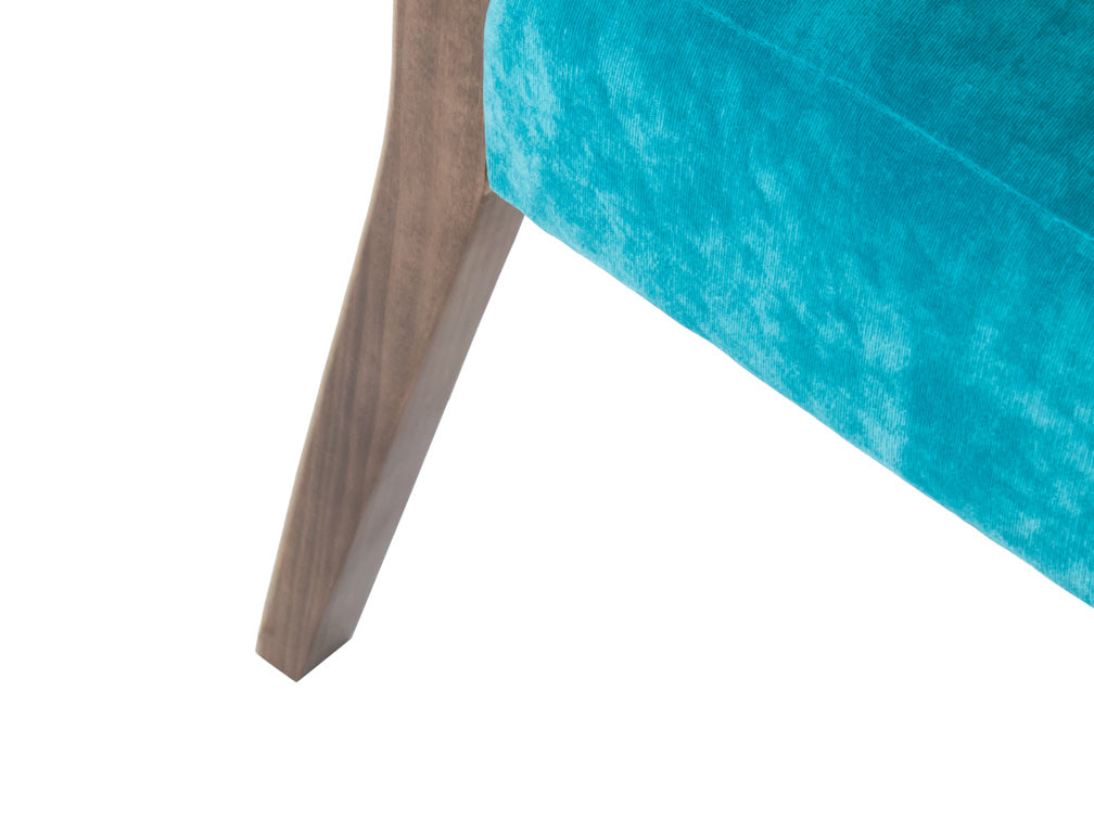 Esta silla es de madera de poplar en color nogal y tapiz de suede en color aqua.