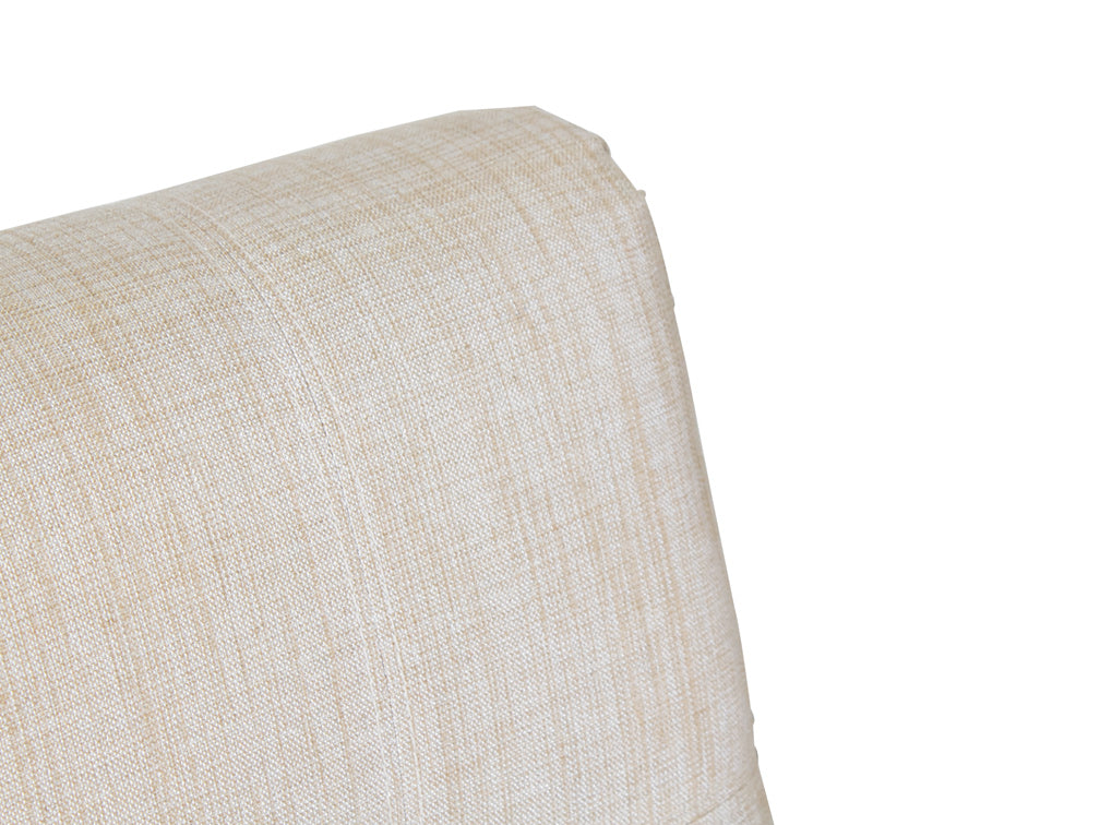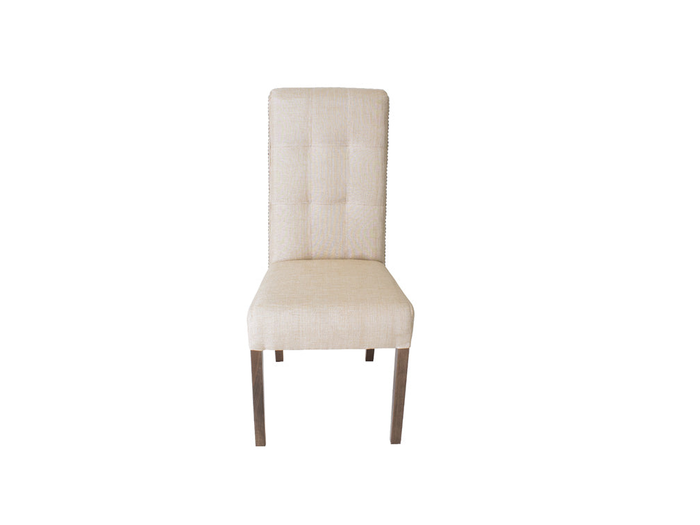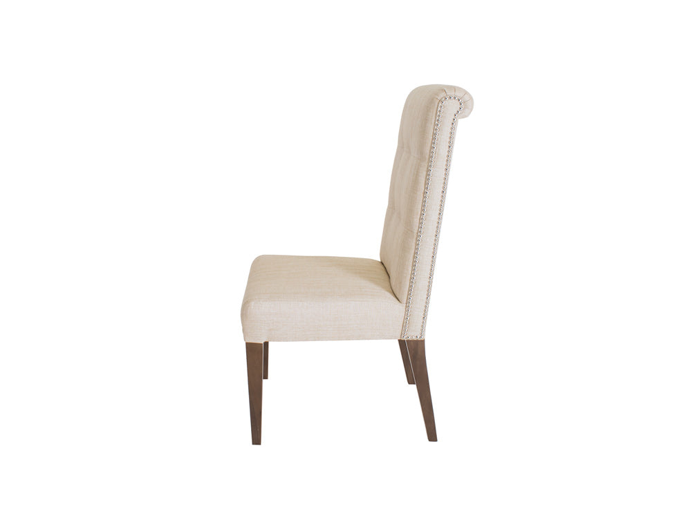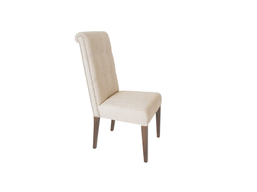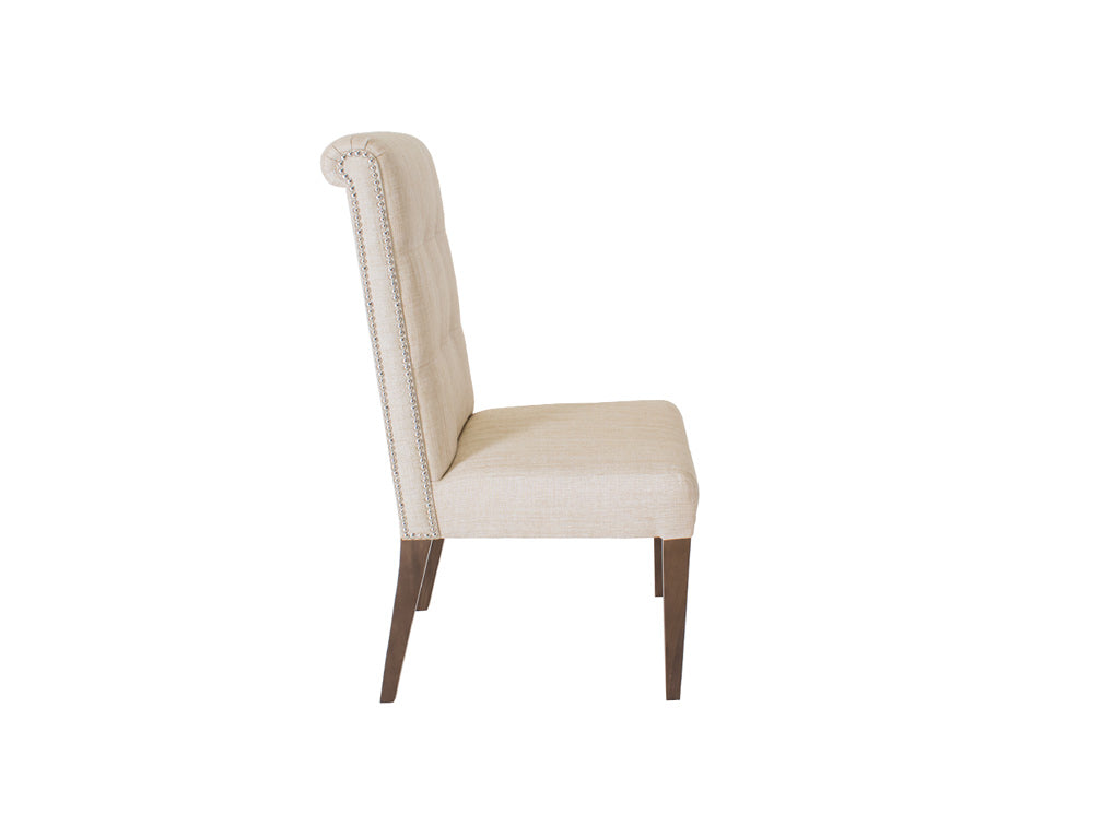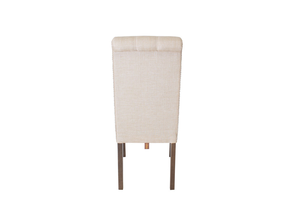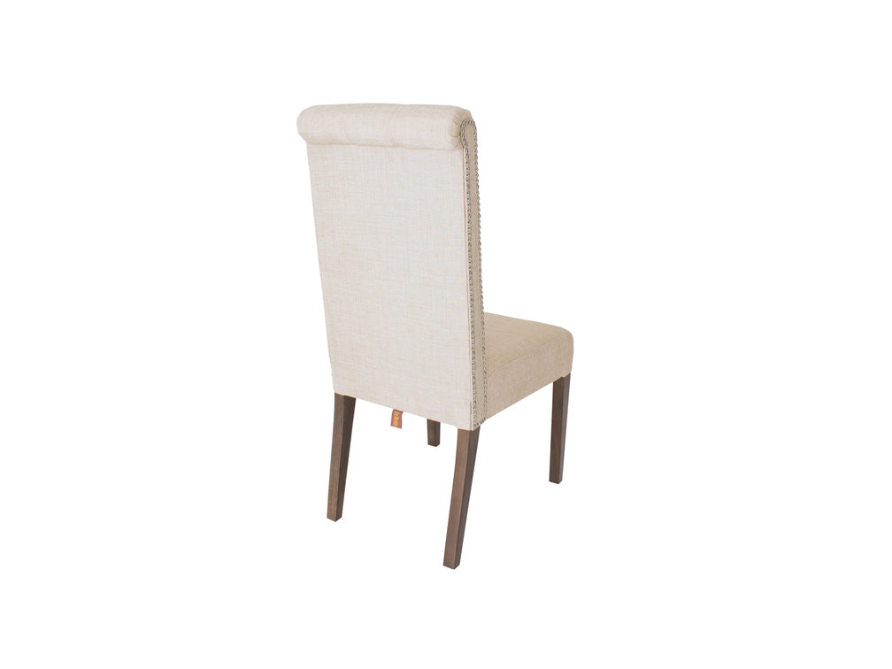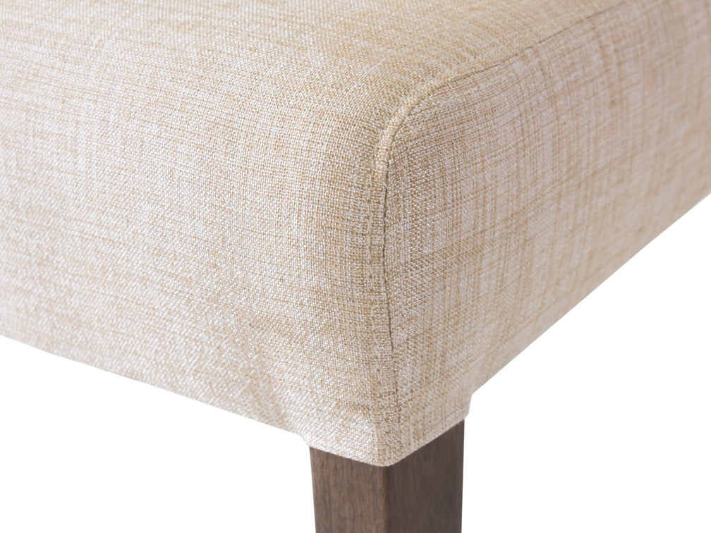 Esta silla para comedor ilustrada es de madera de poplar en color nogal claro y tapiz alcaparra en color crema.