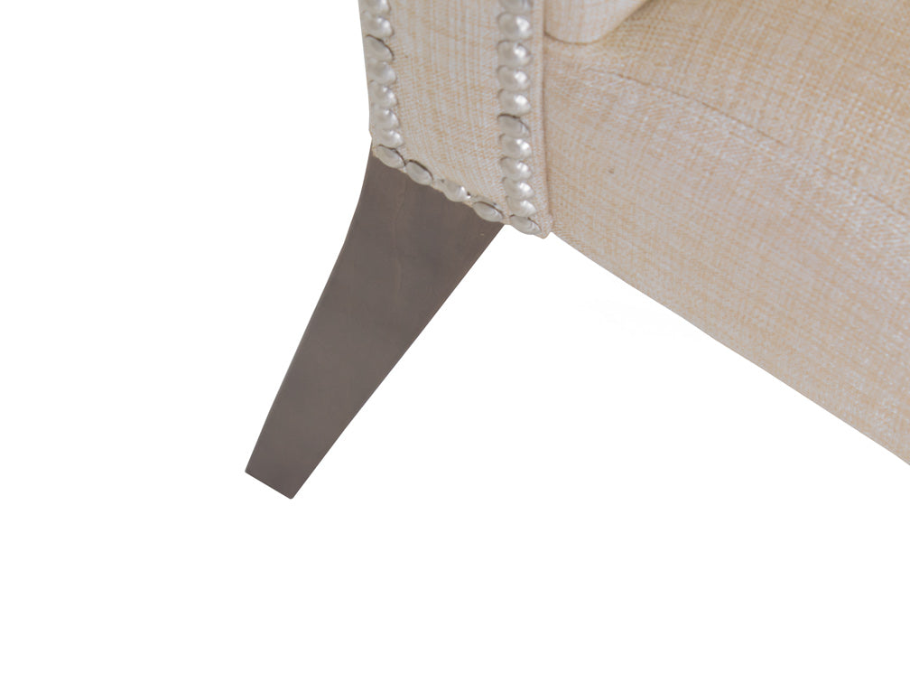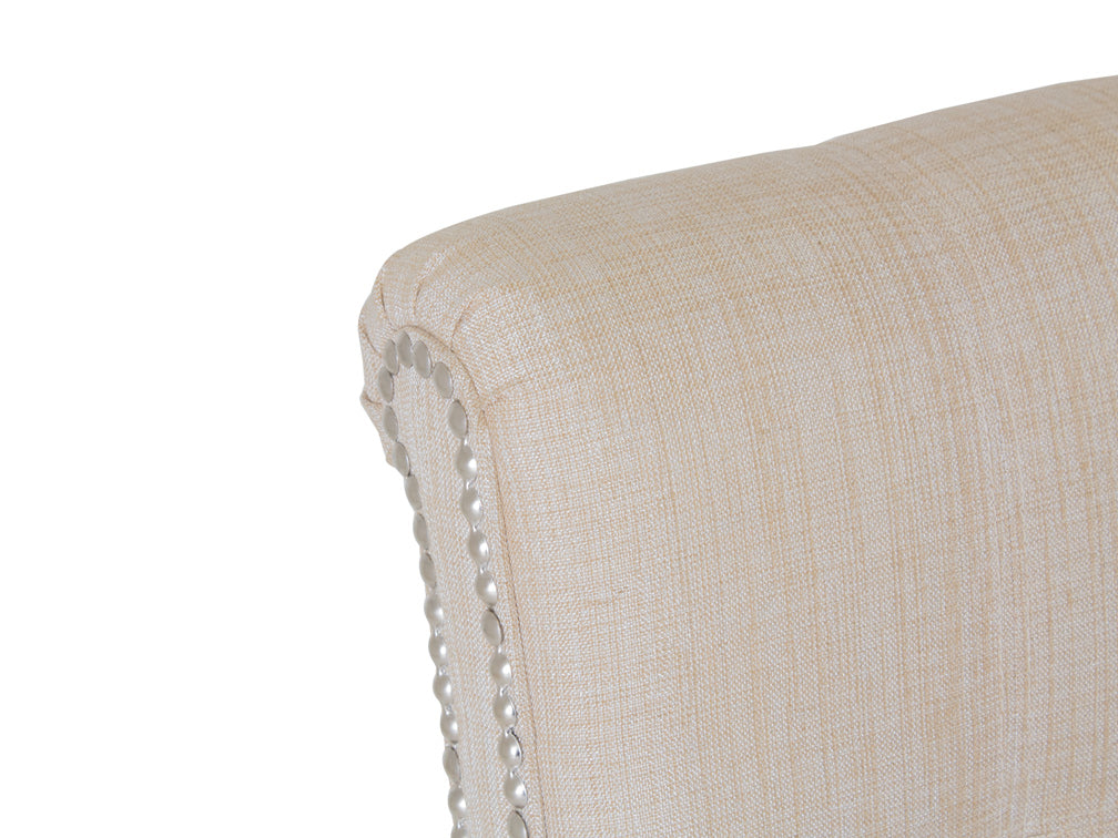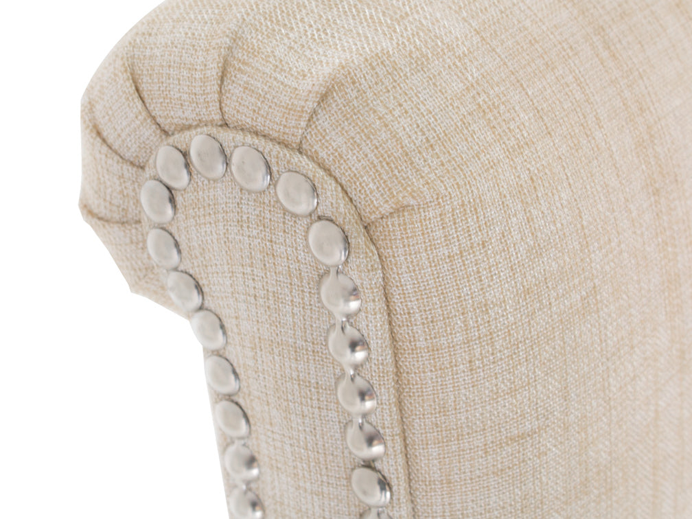 Y en los laterales tiene un elegante diseño de tachuelas cromadas que resaltan su diseño y la curva superior del respaldo.